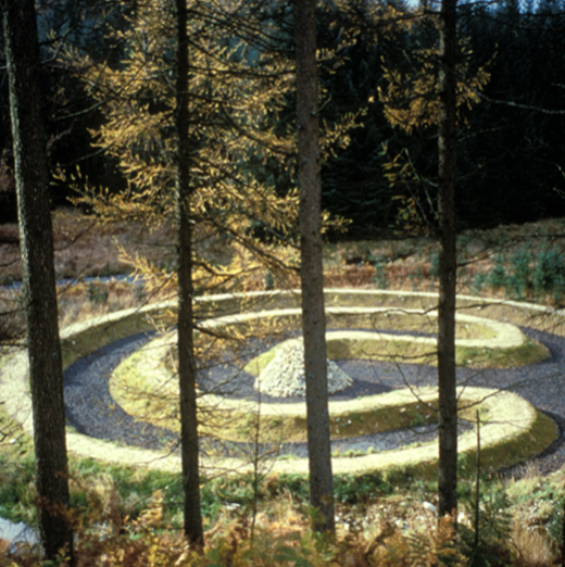 A thirty metre diameter raised labyrinthine walk, leading to a central stone cairn. Created as an enticement to stop passing traffic and encourage people to take a reflective walk in Nature, bathed in the sounds of the adjacent River Dee. All materials for the labyrinth were gathered locally within the forest, and with twenty years elapsing since construction, Nature is endeavouring to reclaim them.